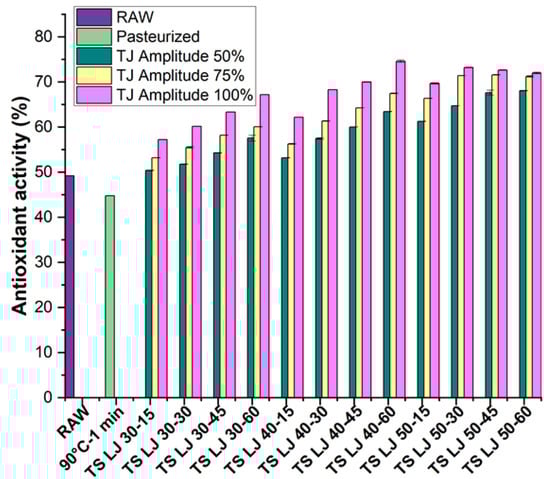 Effects of pasteurisation and thermosonication (50, 75, and 100% amplitude) on antioxidant activity levels of lapsi juice. For sample codes, refer to Figure 2.