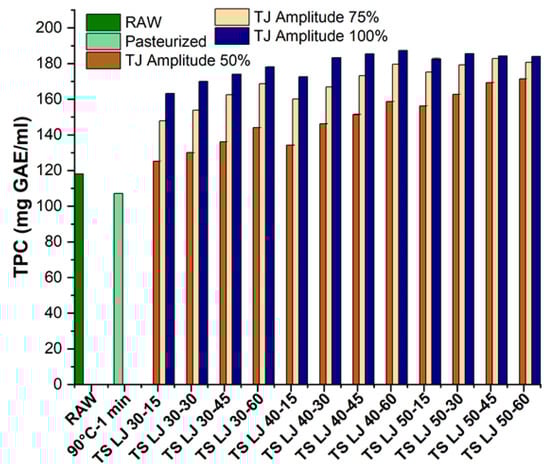 The study shows that the TPC of TSLJ increased compared to that of raw and PSLJ samples, as observed in Figure 4. Furthermore, as previously stated by an investigator [], an upsurge in TPC after TS is possibly a result of the removal of confined molecules of O2 from the lapsi juice samples. In addition, treatment temperature possessed a significant (p < 0.05) impact on the total amount of phenols (at each amplitude), and the TPC of lapsi juices increased with amplitude and temperature.