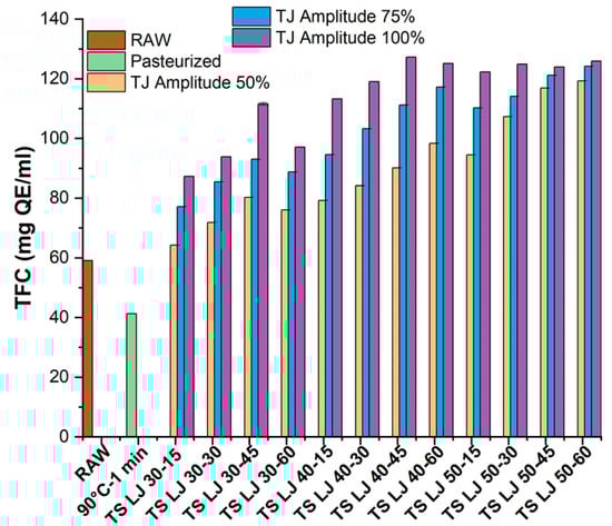 Effects of pasteurisation and thermosonication (50, 75, and 100% amplitude) on the total flavonoid content of lapsi juice. For sample codes, refer to Figure 2. TFC, total flavonoid content; QE, quercetin equivalent.