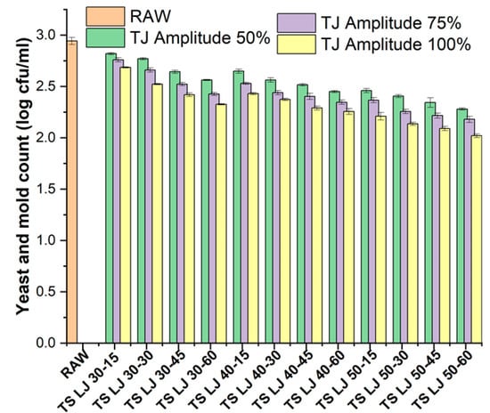 The YMC of the TS-treated juice was lower than the YMC of the fresh juice samples (2.94 ± 0.04 log cfu/mL), ranging from 2.02 ± 0.02 to 2.82 ± 0.01 log cfu/mL. However, unlike the TPC, the YMC was not completely eliminated, which could be attributed to yeast and mould’s higher resistance to sonication compared to that of bacterial populations, as previously reported []. A decrease in YMC is caused by an increase in either amplitude or temperature. This implies that higher levels of amplitude and temperature have a greater effect on reducing YMC than lower levels of these parameters. Yeast and mould counts can be reduced for a variety of reasons by using thermosonication with a high amplitude, temperature, and time. One possible explanation is the physical effect of cavitation, which can damage the cell membrane and cause cell death. Another reason is the generation of free radicals, which can lead to oxidative stress and cell damage. Furthermore, an increase in temperature can cause protein denaturation, which can result in microorganism inactivation. The combination of these effects can result in a reduction in yeast and mould counts in treated juice []. To produce juices with the least amount of nutritional and sensory loss, additional antimicrobials or high-pressure recuperation might be required in addition to thermosonication.