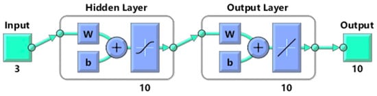 The optimal parameters for the artificial neural network (ANN) were determined using various criteria such as a correlation plot, mean absolute error, correlation coefficient, and performance plot, as described in previous studies []. After testing different network topologies, a network with a hidden layer of ten neurons was found to provide the best results. The structure of the well-trained ANN model with the optimal topology (3:10:10) is presented in Figure 7, where the connection weights between neurons in different layers and the bias/ tipping-point values of neuron layers (hidden and output) are organised in the form of a matrix. Specifically, the acreage of the matrix of the neuronal connection weights among neurons of layers (input and hidden) was 10 × 3, and the acreage of matrix of the connection weights between neurons of the hidden and output layers was 10 × 10. Finally, the size of matrix of the bias/ tipping-point values of neurons (hidden and output layers) was 10 × 1 and 10 × 1, correspondingly.