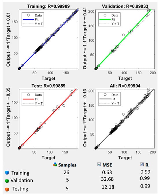 The correlation coefficient (R) of training, test, and all data of the well-developed ANN model. MSE, mean square error; Output, predicted data generated by the ANN; Target, expected outcome for the given input; Training, adjustment in internal parameters (weights and biases) based on a labelled dataset; Testing, accuracy, precision, recall, and mean square error, depending on the type of task (classification or regression); Validation, monitoring and fine-tuning of the model’s performance; ANN, artificial neural network.