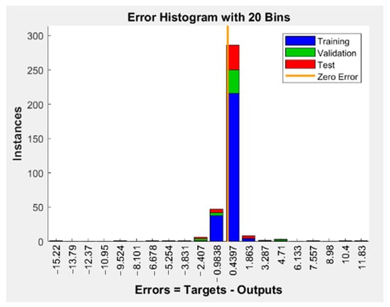 Error histogram of the developed ANN model. Instances, the number of data points or examples that fall into different error or loss bins within the histogram; Zero error, model’s predictions matching the true target values exactly for those instances; ANN, artificial neural network.