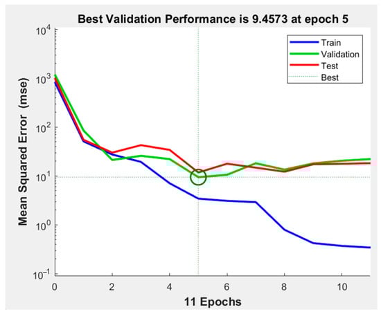 Three sets of the 36 experimental observations were selected at random for training (75% of the experimental data), validation (15% of the experimental data), and testing (15% of the experimental data) purposes, respectively. The network parameters were established using the training process, validated to evaluate the network parameters’ stability, and tested for the management of network parameter error []. In this study, a neural network model with input (three), hidden (ten), and output (ten) layers was used, as shown in Figure 7. To develop the ideal ANN model for predicting responses, it was necessary to estimate the neuron numbers within the hidden layer by continually training the entire network until a minimum MSE and maximum R was achieved. Based on the results, the hidden layer’s number of neurons was set to ten, which showed that the minimum MSE for pH, TSS, TA, CI, BI, AA, AOA, TPC, TFC, and YM were 0.42, 0.17, 0.77, 0.47, 0.82, 0.10, 0.21, 0.25, 0.96, and 0.13 for the training, testing, validation, and all sets of data, respectively. Figure 8 and Figure 9 show the ANN schematic’s post-training effectiveness, an error histogram, and analysis of regression. The performance of MSE for training, validation, and testing data as a function of the number of epochs is presented in Figure 10. The plot shows that the network performance improves as the number of epochs increases, and the best authentication performance was at 5 epochs, with an MSE reading of 9.4573. According to the erroneous value histogram in Figure 8, numerous information points have an error value of 0.4390, indicating that the model performs well in predicting the target values. Figure 8 depicts the results of the regression test, which reveals a significant relationship between the anticipated results and the real target values for all data sets. Table 4 shows the predicted values of the responses obtained using the ANN model, and there is good match between the actual and predicted values, as shown in Table 3 and Table 4. This strong correlation between actual and predicted values confirms the model’s stability. This model’s successful performance is significant because it illustrates how useful it could be as a forecasting tool for future experiments. When conducting experiments, time and resources can be saved by using the ANN model to predict the response for a specific set of input parameters. The strong correlation between the actual and predicted values also boosts confidence in the data’s dependability and the precision of the experiment’s findings. Despite the ANN model’s encouraging results, it is essential to remain aware that the model must still be validated using more experimental data. This may aid in enhancing the model’s accuracy and dependability even more. Overall, the accuracy with which the ANN model was able to predict the response is a positive development for the field of food processing and may pave the way for more effective and efficient processing methods [,,].