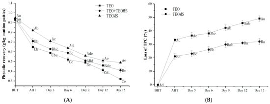 (A) Stability of phenolic compounds in TEO and TEOMs in the simulation system; (B) stability of phenolic compounds in mutton patties. TEO: thyme essential oil; TEOMs: thyme essential oil microcapsules; BHT: before heat treatment; AHT: after heat treatment. Values with different letters (A–C) at the same sampling time were significantly different (p < 0.05). Values with different letters (a–e) in the same batch were significantly different (p < 0.05).