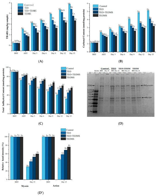 (A) Effects of different treatments on TBARS values in mutton patties; (B) effects of different treatments on carbonyl content in mutton patties; (C) effects of different treatments on total sulfhydryl content in mutton patties; (D) representative SDS-PAGE gel of myofibrillar protein; (D’) analysis of relative optical density intensity of myosin and action bands. TEO: thyme essential oil; TEOMs: thyme essential oil microcapsules; BHT: before heat treatment; AHT: after heat treatment. Values with different letters (A–D) at the same sampling time were significantly different (p < 0.05). Values with different letters (a–f) in the same batch were significantly different (p < 0.05).