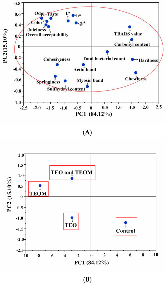 Principal component analysis (PCA) for lipid oxidation, protein oxidation, microbial, color, and sensory qualities of mutton patties after storage for 15 days: (A) loadings for the first two principal components; (B) weighed PCA bi-plot of scores. TEO: thyme essential oil; TEOMs: thyme essential oil microcapsules; *: the difference is significant.