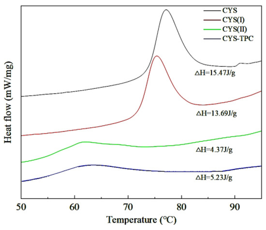 DSC curves of native and modified starches. The abbreviations CYS–TPC, CYS(II), CYS(I), CYS represent, separately, Chinese yam starch–tea polyphenol complex, Chinese yam starch (II), Chinese yam starch (I), and Chinese yam starch.