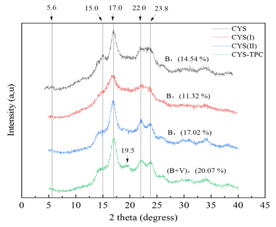 The XRD patterns and relative crystallinity of the native and modified starches are shown in Figure 3. CYS showed apparent peaks at 5.6°, 15.0°, 17.0°, 22.0°, and 23.8°, corresponding to a B-type crystalline structure. No significant change in the position of the diffraction peaks was observed for CYS(I) or CYS(II), implying that the autoclave-assisted pullulanase treatment had no influence on the crystalline pattern of Chinese yam starch, and, thus, the two samples exhibited B-type crystalline structures. However, CYS(I) showed a decrease in relative crystallinity from 14.54% to 11.32% compared with the native starch. This result showed the crystalline regions of starch or the hydrogen bonds between double helix granules had been destroyed during the pasting process. In contrast, the short linear chain content in CYS(II) increased after pullulanase treatment, which led to higher molecular mobility and promoted starch recrystallization at a low temperature, resulting in a relative crystallinity increase of 17.02%. With the addition of tea polyphenol during autoclaving, CYS–TPC showed an apparent peak at 19.5°, which was a typical peak of a V-type crystalline structure, and, therefore, CYS–TPC showed a B+V-type crystalline structure. This result demonstrated that stable clusters might be formed between tea polyphenol and the amylose helical cavity through hydrophobic interactions. At the same time, a non-inclusive structure formed between starch side chains, and tea polyphenol was weakly linked by hydrogen bonds [36]. Moreover, compared with other starches, the relative crystallinity of CYS–TPC increased to 20.07%, which indicated that CYS–TPC had more crystalline regions and a more compact structure and, thus, exhibited more resistant to enzymatic degradation [37].