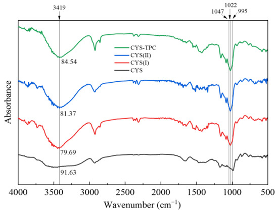 The FT-IR spectra of native and modified starches are presented in Figure 4. All samples presented similar and typical FT-IR spectrograms. There were no disappearances or appearances of new peaks in the modified starches, which indicated that the modified technique in this study produced physical but not chemical changes in the starches. The IR bands obtained between 3000 and 3600 cm−1 were associated with O-H stretching and hydrogen bonds. The weaker intensity of the absorption peak at 3419 cm−1 reflected a lower content of O-H and higher content of hydrogen bonds [38]. Compared with CYS, the absorption peak of the O-H bending vibration of the modified starches was significantly narrowed. The order of peak sizes was CYS > CYS–TPC > CYS(II) > CYS(I), which reflected the higher content of hydrogen bonds formed in the starch molecules during the modification process. This result suggested a pronounced effect of the modified treatment used in this study on starch degradation and molecular rearrangement during recrystallization and that the effect of adding tea polyphenol during autoclaving was very significant. It could also be inferred that the tea polyphenol interacted with starch mainly via hydrogen bonding, and the hydrogen bond forces formed in CYS–TPC were stronger than those between starch molecules [39].