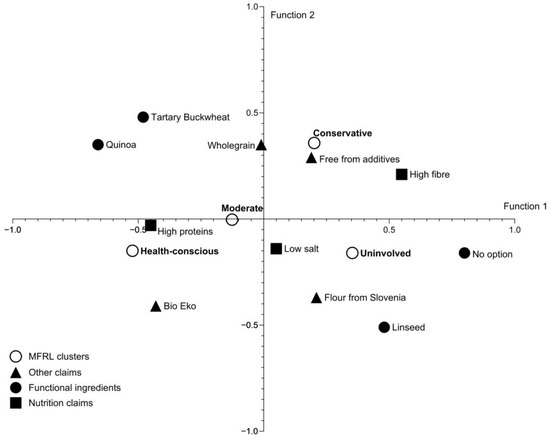 A discriminant analysis was carried out to enable the examination of the extent to which the selected attribute levels could discriminate between the MFRL clusters. The results of the conjoint levels of individual part-worth utilities identified three canonical discriminant functions, with the first two explaining 89.1% of the variance of the between groups difference (Supplementary Table S1). The percentage of correct classification following the discriminant analysis was 62.4%. Using the test for equality of group means, we identified that several attribute levels were significantly influenced by the discrimination capacity between the FRL segments. The results show three functional ingredients (quinoa, Tartary buckwheat, and linseed) and staple wheat bread (without any functional ingredients), the nutrition claims ‘high fibre’ and ‘high protein,’ and the other claim ‘organic’ as significantly important drivers for differences between the observed segments (Supplementary Table S1). The results show that Conservative consumers are more likely to prefer wholegrain and free-from-additives breads compared to other segments. On the other hand, the ‘high protein’ and ‘organic’ claims are more likely to be favoured by Health-conscious consumers, while staple wheat bread, linseed-enriched bread, and bread produced from flour from Slovenia are more likely to be favoured by the Uninvolved segment (Figure 1).