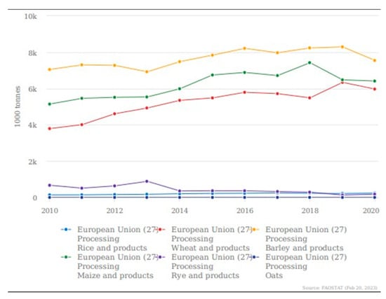 Processing of wheat, maize, rice, rye, barley, oats, and related products in the European Union (27 member states). Source: compiled by authors, based on FAOSTAT online database, 20 February 2023.