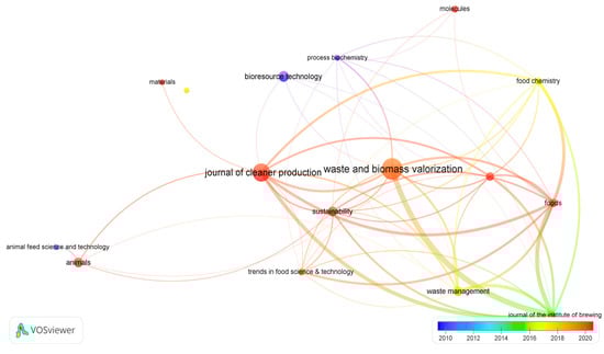 There was an increase in the number of articles related to the use of waste resulting from grain processing starting in 2018, indicated by the red circles. The diameter of these circles is proportional to the number of articles published per year in the most productive journals in the field. This is due to the continuous concerns at the level of the European Union and the world regarding the regulations and scientific approach to facilitate the use and valorization of grain waste and by-products from the food chain, without compromising food and feed safety, in compliance with CE concepts.