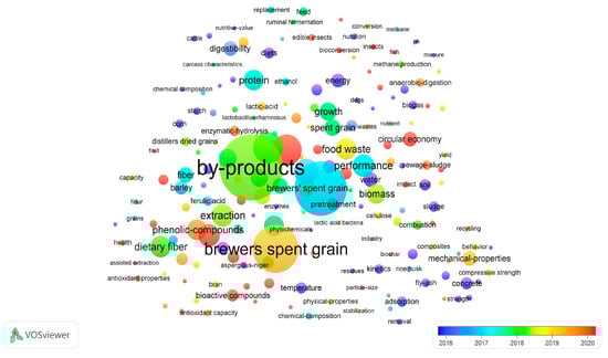 A word cloud constructed according to searched keywords is shown in Figure 4. The font size of the given keywords is proportional to the number of times that the keyword appeared in the literature. The most numerous occurrences are naturally represented by the keywords (grain waste and by-products) and the terms used most often in the management of waste resulting from grain processing, such as circular economy, food waste, biomass, brewer’s spent grain, phenolic compounds, dietary fiber, pretreatment, extraction, etc.