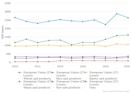 Cereal losses for wheat, maize, rice, rye, barley, oats, and related products in the European Union (27 member states). Source: compiled by authors, based on FAOSTAT online database, 20 February 2023.