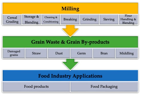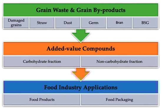 The large volume of low-cost by-products and waste from grain processing provides the economical advantage of its potentially valuable components for the food industry. The present paper, carried out using a review of the literature concerning grain waste and by-product recovery and their industrial applications in the food industry, shows that the majority of researches focus on restricted examples and pilot-scale laboratory experiences, which are currently too costly to upscale, while only a few cases study existing full-scale examples. The main application of these processes on an industrial scale consists of the direct incorporation of grain by-product waste with classic ingredients from the bakery, meat, and dairy industries in order to improve the nutritional, rheological, or sensory properties of the final product. The results highlight the use of grain waste and by-products mainly as additives, for texture improvement, as acidulant, flavoring agent, or preservative in food production, or as biodegradable materials (e.g., paper and biofilm for food packaging).
