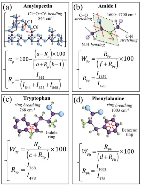 - Pezzotti, G.; Zhu, W.; Chikaguchi, H.; Marin, E.; Masumura, T.; Sato, Y.-I.; Nakazaki, T. Raman spectroscopic analysis of polysaccharides in popular Japanese rice cultivars. Food Chem. 2021, 354, 129434. [Google Scholar] [CrossRef]