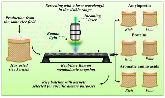 - Pezzotti, G.; Zhu, W.; Chikaguchi, H.; Marin, E.; Boschetto, F.; Masumura, T.; Sato, Y.-I.; Nakazaki, T. Raman molecular fingerprints of rice nutritional quality and the concept of Raman barcode. Front. Nutr. 2021, 8, 663569. [Google Scholar] [CrossRef] [PubMed]