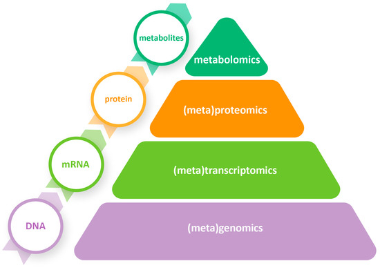 Fermentation is a complex biochemical procedure involving multiple metabolic pathways and interactions between different microorganisms [5]. Classic culture-dependent techniques can only capture a small fraction of the complicated microbiota of fermented foods, and they can only provide limited information about the specific role of each microorganism [19]. Recent culture-independent methods, such as omics technologies, offer an in-depth understanding of the different mechanisms associated with the fermentation process [24]. Omics is a field of study that includes, among others, genomics, transcriptomics, proteomics, and metabolomics, with all their meta-omics derivatives, such as metagenomics, metatranscriptomics, metaproteomics, and meta-metabolomics (metabolomics from now on) (Figure 2).