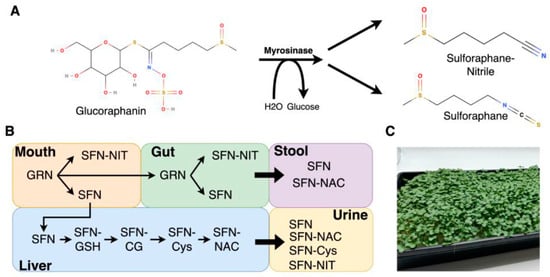 GRN/SFN chemical structures and metabolite secretion schematic. (A) Chemical structures of GRN, SFN, and SFN-NIT. (B) GRN and SFN metabolism and secretion *. (C) Representative picture of broccoli microgreens used in study. * Not shown—SFN metabolites detected in plasma.