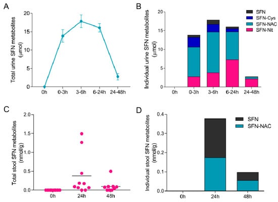 We determined SFN bioavailability and metabolite profiles in urine and stool samples in subjects fed a single serving of broccoli microgreens. In urine samples, the excretion of SFN metabolites peaked at 3–6 h post microgreen consumption and a small amount was present in the urine from 24 to 48 h (Figure 2A). SFN and SFN metabolites (SFN-Cys, SFN-NAC, and SFN-NIT) were detected in all subjects, with SFN-NAC being the most abundant at 0–3 and 3–6 h post microgreen consumption (Figure 2B). SFN-NIT excretion peaked at 6–24 h and remained detectable at 24–48 h (Figure 2B). No SFN-CG and SFN-GSH were detected in urine samples. Total mean urine SFN metabolite excretion over the 2-day study was 50.5 ± 2.7 μmol. The urine SFN metabolites profiles in microgreens-fed subjects were similar to those reported previously in broccoli sprouts-fed subjects, including the detection and excretion profile of SFN-nitrile [,].