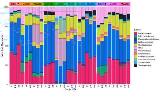 Alpha diversity is not impacted by consumption of a single serving of broccoli microgreens. Relative abundance of microbial families present in the stool of each participant at each time point following consumption of broccoli microgreens (n = 11). Top 10 more prevalent families compromising >75% of each sample is shown, the rest are agglomerated into category “other”. Subject ID is listed above, time following consumption of broccoli microgreens below, and the size and color of each bar corresponds to the relative abundance of microbial family, respectively.