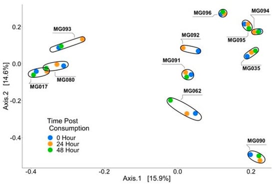 To determine if consumption of microgreens affects microbiome composition, alpha and beta diversities were evaluated in subjects’ fecal samples. No measure of alpha diversity was significantly different between time points (Figure 3). Similarly, beta diversity was also not significantly different over time (Figure 4). Differential abundance testing was conducted to identify microbes differentially abundant between time points, and no ASVs were found to be differentially abundant across time. Overall, a single serving of broccoli microgreens did not alter microbiome composition. Previous studies have shown that the prolonged consumption of cruciferous vegetables can significantly alter microbiome composition; however, these studies used a dietary intervention period of at least 14 days [,,]. We detected no alterations to the gut microbiome in our study, suggesting a single feeding of microgreens was insufficient to affect microbiome composition. Studies in rodents have shown that the non-glucosinolate components of broccoli are responsible for the gut microbiome modulation observed; thus, it is unclear whether the gut microbiome would shift with the prolonged feeding of microgreens as it does with broccoli [,]. Concordant with other studies, we also observed high inter-individual variation in the excretion of SFN metabolites. While the source of this variation is still unknown, it could in part be driven by differences in an individual’s gut microbiome composition. All participants in this study consumed a standardized breakfast with the microgreens, and, thus, differences stemming from dietary components consumed with the microgreens most likely do not explain differences in SFN metabolites. Furthermore, studies examining GST polymorphisms have shown that null-genotypes of GSTM1 and GSTT1 can alter exposure time to SFN metabolites [,,]. However, this would not explain inter-individual differences in the production of SFN from GRN.