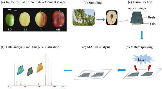 The matrix-assisted laser desorption/ionization MSI (MALDI-MSI) analysis of jujube fruits at different development stages: (a) jujube fruits at four stages (LG, BS, BH, and QH), and (b–f) experimental procedure of MALDI-MSI for analyzing jujube fruits.