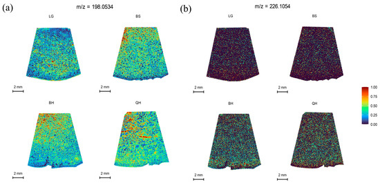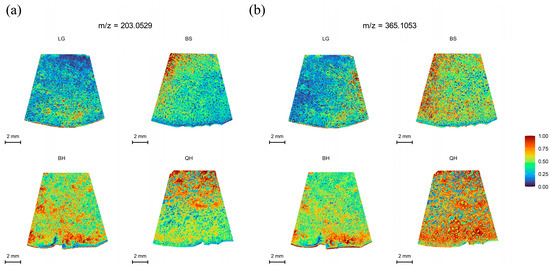 Sweetness is an important indicator that determines fruit quality and market value. Sugars such as glucose, fructose, and sucrose are the major sugars found in most fruits, including peaches, apples, watermelons, and cherries [27]. Each type of sugar represents a different level of sweetness [28], with fructose being the sweetest, followed by sucrose, and glucose being the least sweet. However, glucose exhibits the best fruit flavor [29]. These sugars play important regulatory roles in the growth, development, and ripening of fruits [30]. In practice, it is not possible to distinguish glucose from fructose using MALDI-TOF IMS alone because they have the same molecular weight (180.06284) [31]. The same situation occurs with sucrose and maltose, as they both have a molecular weight of 342.115663. Therefore, in this study, only the distribution of hexoses (glucose and fructose, m/z 203.0529) and sucrose/maltose (m/z 365.1053) in jujubes at four different developmental stages was determined. As shown in Figure 3, both hexoses and sucrose/maltose exhibited a significant increase from the LG stage to the QH stage, reaching the highest level at the QH stage (Figure 3a,b). These results are consistent with the findings of Zhao et al. [32] and Guo et al. [33] regarding soluble sugars in jujubes. Moreover, this trend is similar to the sugar accumulation trend observed in other fruits such as strawberries and wolfberries [14,34]. Previous studies have shown that sucrose acts as a signal for inducing fruit ripening and ABA accumulation, thereby participating in the regulation of fruit ripening [30,35]. This could explain why hexoses and sucrose/maltose show the highest intensity at the QH stage compared to other stages (Table S2).