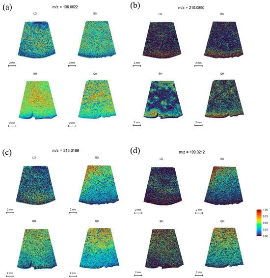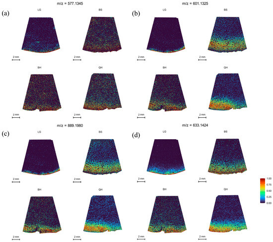 Procyanidins (PA), one of the major polyphenolic compounds in jujubes, possess various physicochemical properties and biological activities, including antioxidant, anticancer, and cardiovascular activities [42]. They contribute to the formation of pigments, flavors, and nutritional value [43]. In this study, the spatial distribution of procyanidin A at m/z 577.1345, procyanidin B at m/z 601.1325, and procyanidin C at m/z 889.1980 was analyzed, and the results are shown in Figure 5. Procyanidin A was found to be distributed in lower amounts in jujube fruits at different developmental stages (Figure 5a), and its relative intensity showed a decreasing trend followed by an increasing trend (Table S2). In contrast, procyanidin B and procyanidin C exhibited distinct distribution patterns in the fruit periphery and peel at different periods, showing an increasing trend followed by a slight decrease and then an increase again, with the highest distribution at the BS stage (Figure 5b,c). Rutin, a flavonoid compound, also contributes to fruit nutrition and pigment formation and has various beneficial health effects [44]. Rutin showed a characteristic of higher relative intensity at the LG and QH stages compared to the other two stages (Table S2), and its spatial distribution increased as the fruit ripened (Figure 5d). The higher distribution at the QH stage is associated with fruit ripening and the reddening of the fruit peel.