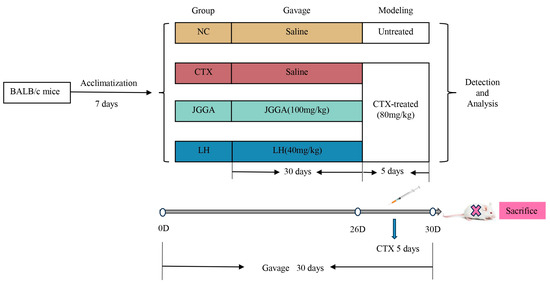 SPF-grade male BALB/c mice, weighing 20 ± 2 g, were purchased from Shanghai Slac Laboratory Animal Co., Ltd. (Shanghai, China) (License No. SCXK (Shanghai, China) 2017-0005). Compared to female mice, male mice exhibit more stable hormone levels and enzyme activities, along with better overall health indicators. Therefore, we chose to utilize male mice in our study. Animal experiments were conducted in accordance with the ethical guidelines for animal experimentation and were approved by the Animal Center of Fujian Agriculture and Forestry University. The mice were housed at a temperature of 22 ± 2 °C with a humidity of 50 ± 2% during the acclimatization period. They had free access to food and water throughout the study. After the acclimatization period, the mice were randomly divided into four groups, each consisting of eight mice. The groups were as follows: (1) JGGA: mice were orally administered JGGA at a dose of 100 mg/kg/day; (2) NC and CTX: both the blank and model groups were orally administered distilled water in the same volume as the JGGA group; (3) LH: mice were orally administered levamisole hydrochloride (LH) at a dose of 40 mg/kg/day as a positive control group. As is shown in Figure 1, all mice were continuously gavaged for 30 days, and starting from day 26, all groups except the NC group were injected with cyclophosphamide (80 mg/kg) for 5 consecutive days to induce immune suppression and create an immunocompromised mouse model.