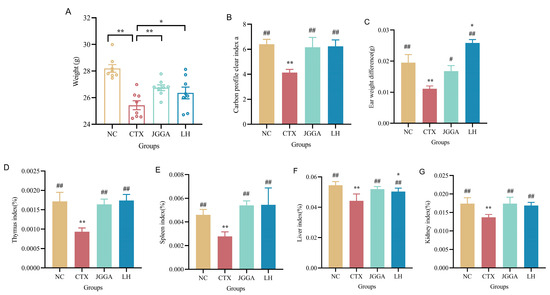 Changes in organ index and body weight levels in each group during the experimental period. (A) Changes in body weight of different groups of mice after 4 weeks. (B) Results of carbon profile index in different groups of mice after 4 weeks. (C) Results of hypersensitivity reaction in different groups of mice after 4 weeks. (D) Results of thymus index in different groups of mice after 4 weeks. (E) Results of spleen index in different groups of mice after 4 weeks. (F) Results of liver index in different groups of mice after 4 weeks. (G) Results of kidney index in different groups of mice after 4 weeks. NC: normal group; CTX: immunocompromised group; JGGA: Ganoderma lucidum, Grifola frondosa, and American ginseng extract formulation at a dosage of 100 mg/kg/day; LH: levamisole hydrochloride at a dosage of 40 mg/kg/day. The data are presented as mean ± SD (n = 8). * p < 0.05 and ** p < 0.01 vs. NC group; # p < 0.05 and ## p < 0.01 vs. CTX group.