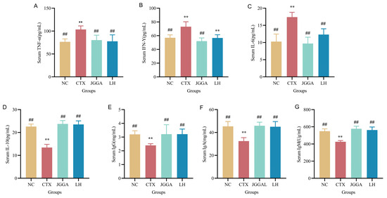 Serum index levels of each group of mice during the experiment. (A) TNF-α content in serum of different groups of mice after 4 weeks. (B) IFN-γ content in serum of different groups of mice after 4 weeks. (C) IL-6 content in serum of different groups of mice after 4 weeks. (D) IL-10 content in serum of different groups of mice after 4 weeks. (E) IgG content in serum of different groups of mice after 4 weeks. (F) IgA levels in serum of different groups of mice after 4 weeks. (G) IgM levels in serum of different groups of mice after 4 weeks. NC: normal group; CTX: immunocompromised group; JGGA: Ganoderma lucidum, Grifola frondosa, and American ginseng extract formulation, dosage 100 mg/kg/day; LH: levamisole hydrochloride, dosage 40 mg/kg/day. The data are displayed as mean ± standard deviation (n = 8). ** p < 0.01 vs. NC group; ## p < 0.01 vs. CTX group.