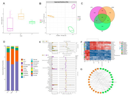 (A) Box plot displaying the Shannon index of cecal microbiota at 4 weeks. Green: NC group; Purple: CTX group; Orange: JGGA group. (B) PLS-DA map illustrating the cecal microbiota at 4 weeks. Green: NC group; Purple: CTX group; Orange: JGGA group. (C) Venn diagram showing the cecal microbiota at 4 weeks. Green: NC group; Purple: CTX group; Orange: JGGA group. (D) Bar chart presenting the relative distribution at the gate level for the top 20 species with relative abundance, color ordered according to the legend on the right. (E) Error diagram demonstrating the differential expansion of microbiota in mouse intestinal contents. Green: NC group; Orange: CTX group; Purple: JGGA group. (F) Spearman’s correlation analysis between cecal microbiota and physicochemical parameters. The strength of the association between different cecum microbiota and immune-related parameters is represented using shades of color. The color red indicates a positive correlation, while the color blue indicates a negative correlation. * p < 0.01, ** p < 0.01, *** p < 0.001 (G) Network diagram based on significant differences in cecum microbiota and immunophysico-chemical parameters. Each node represents a genus of gut microbiota (green node) or a parameter related to immunological indicators (orange node). The black solid line and gray dashed line represent positive and negative correlations, respectively. Line width indicates the strength of the correlation. Network parameters for Spearman’s correlation test (|r| > 0.7, FDR adjusted p < 0.05).