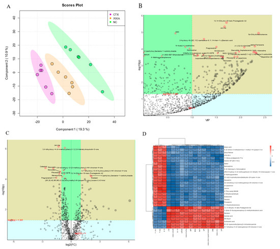 (A) PLS-DA point cloud map of fecal metabolites. Green: NC group; Purple: CTX group; Orange: JGGA group. (B) Importance diagram of metabolites in PLS-DA analysis. (C) Volcano plot representing multiple variations of metabolites. Each point represents a metabolite, with the size indicating the magnitude of multiple variation (log10 (p-value)). (D) Spearman’s correlation analysis between fecal metabolites and physicochemical parameters. The strength of the association between fecal metabolites and immune-related parameters is represented using shades of color. The color red indicates a positive correlation, while the color blue indicates a negative correlation. * p < 0.01, ** p < 0.01, *** p < 0.001.
