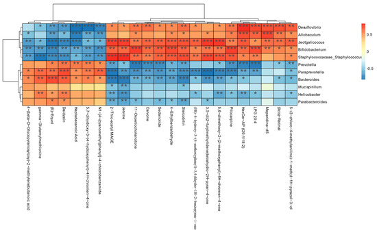 Statistical Spearman’s correlation of fecal metabolites with cecal microorganisms. The color scheme indicates the strength and direction of the correlation: red represents positive correlation, blue represents negative correlation, with darker shades indicating stronger correlation. * p < 0.01, ** p < 0.01, *** p < 0.001.