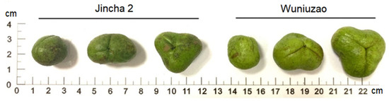 The ripe fruit of Jincha 2 and Wuniuzao cultivars. The ripe fruits are spherical (one compartment), renal (two compartments), and triangular (three compartments) in Jincha 2 and Wuniuzao.