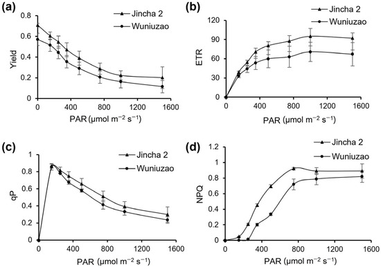 Photosynthesis efficiency analysis of Jincha 2 and Wuniuzao cultivars. (a) Changes in the effective quantum yield (Yield) of photochemical energy conversion in photosystem II in two cultivars. (b) Changes in the electron transport rate (ETR) of tea leaves in two cultivars. (c) Changes in the photochemical quenching (qP) value in two cultivars. (d) Changes in the non-photochemical quenching (NPQ) in two cultivars. PAR indicates the photosynthetic effective radiation.
