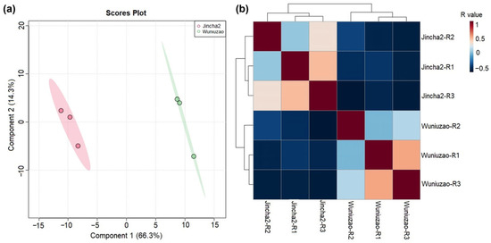 Principal component analysis (a) and correlation analysis (b) of the identified metabolites from Jincha 2 and Wuniuzao cultivars during the peak period of oil transformation. In the PCA analysis, the first principal component (PC1) represents the direction that accounts for the maximum variance in the data, while the second principal component (PC2) is orthogonal to PC1 and captures additional variance. R value means Pearson correlation coefficient.