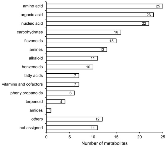We conducted comparative metabolomics studies on Jincha 2 and Wuniuzao during the peak oil conversion period, employing principal component analysis (PCA) to assess the experimental results of both varieties. The PCA analysis showed that the replications from each group were well separated, and differences in metabolite levels were present between the two cultivars (Figure 3). In total, we identified and quantified 183 metabolites in Jincha 2 and Wuniuzao. Compared with Wuniuzao, Jincha 2 exhibited significant differences ninety-four metabolites (p < 0.05), with eighty-seven metabolite levels showing a decrease and seven showing an increase. These identified metabolites were categorized into 13 groups, including amino acids, nucleic acids, organic acids, and other compounds (Figure 4). Jincha 2 exhibited reduced levels of amino acids compared with Wuniuzao, and these amino acids mainly participate in the synthesis of secondary metabolites.