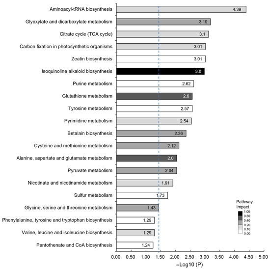KEGG Pathway enrichment analysis of the significantly changed metabolites in tea fruits of Jincha 2 and Wuniuzao cultivars. Numbers inside the bars indicate the value of −Log10 (P). The scale bar of different levels of color indicate pathway impact. Blue dotted line represents p = 0.05.