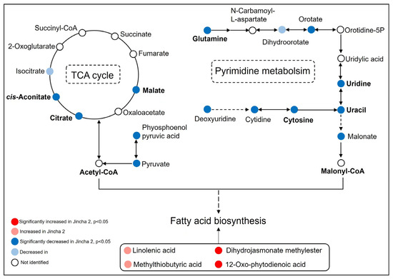 Differential metabolites in tricarboxylic acid cycle, pyrimidine metabolism, and fatty acid biosynthesis in Jincha 2 and Wuniuzao cultivars. The pathways are drawn based on the KEGG database. The detected metabolites are shown in a solid circle, and the undetected metabolites are shown in an empty circle. Colors indicate significance levels of the differential metabolites in Jincha 2 compared with Wuniuzao. Dashed lines indicate multiple steps.