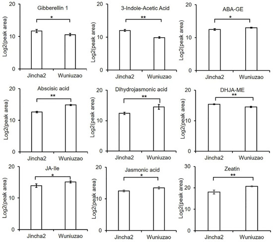 Levels of phytohormones in tea fruits of Jincha 2 and Wuniuzao cultivars during the peak period of oil transformation. Note: * indicates p < 0.05, ** indicates p < 0.01; JA-Ile, jasmonoyl-L-isoleucine; ABA-GE, abscisic acid glucose ester; DHJA: dihydrojasmonic acid; DHJA-ME: dihydrojasmonic acid methylester.