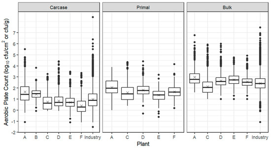 Box plots of the APC of beef carcases (log10 cfu/cm2), primals (log10 cfu/cm2) and bulk meat (log10 cfu/g) from establishments A–F. The box encompasses data between the 25th and 75th percentiles, with the mean indicated by ‘X’ and median by a solid line. Box plots of the whole industry (ESAM data including trial establishments) are also given for carcases and bulk meat; industry data are currently not collected for primals.