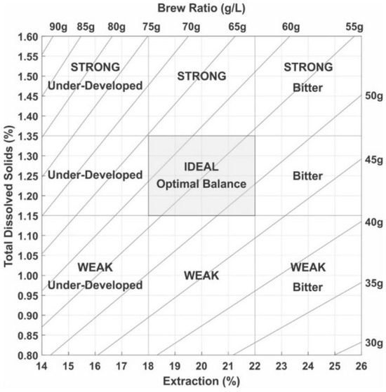 The materials for the study consisted of cold brew coffee drinks purchased directly from the manufacturer ETNO Café in Wroclaw (Lower Silesia in Poland). In accordance with the company’s HACCP rules, all beverages were bottled in a 220 mL amber glass and made exclusively from Arabica coffee from Brazil, which was roasted in a medium-roasted profile. Coarsely ground beans with a diameter of 1.5–2.0 mm were mixed with reverse osmosis water in a corrosion-resistant stainless-steel tank equipped with a 3.0 kW overhead mixer. The extraction process by soaking was carried out until 1.3% tds was obtained under 12 h, followed by filtration through a 200 µm pore-width cartridge filter and HTST pasteurization. During production, the professional REFRACTOMETER ATAGO PAL-COFFEE BX/TDS tool was used to determine whether coffee extraction is processed exactly under the optimal equilibrium according to Lockhart’s diagram (Figure 1). The capacity of the technology reaches 3000 L of cold brew coffee per batch.