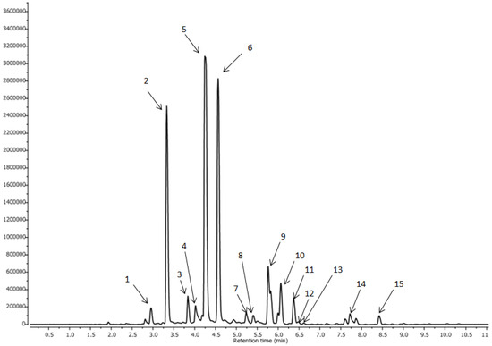 Phenolic compounds are a heterogeneous group of secondary metabolites in plants. In coffee, the most dominant is chlorogenic acid, and it is isomers containing 69 structures in green coffee beans, but the major CGA isomers found in coffee include 3-caffeoylquinic acid (3-CQA), 4-caffeoylquinic acid (4-CQA), and 5-caffeoylquinic acid (5-CQA) [25]. Figure 2 and Table 4 list the 15 compounds identified in experiments using UPLC-MS/MS (with PDA and Q/TOF detectors) along with their retention times (Rt), UV-vis mass profiles of authentic standards, and concentrations per sample in terms of mg/L. All compounds analyzed were reported previously in coffee beans [26,27].