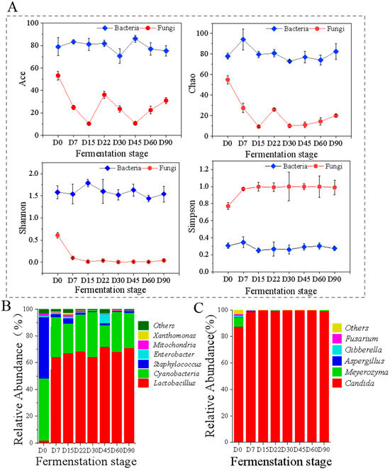 Dynamics in microbial community of Zhalajiao at different fermentation stages. Alpha diversity (A); the relative abundance of bacterial community (B) and fungal community (C) at genus level. Some classes with relative abundance < 1% are regarded as “others”.