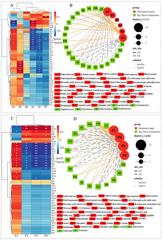 The clustering heatmap (bacteria: (A); fungi: (C)) and correlation network (bacteria: (B); fungi: (D)) between microbial community at genus level and main flavor compounds. The circular and square symbols indicate the preponderant genus and the key flavor components, respectively. Orange and grey lines show a positive and negative correlation, respectively.