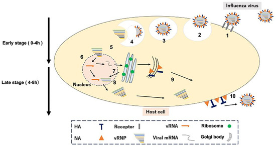 After infection, symptoms such as fever, headache, general malaise, muscle pain, arthralgia, cough, and nasal discharge continue and begin to improve. Figure 1 illustrates the growth steps of influenza virus within mammalian cells. Initially, Influenza viruses recognize glycoproteins on the host cell membrane (Step 1). Virus particles are passively absorbed into the cell via endocytosis, the mechanism of foreign body uptake of the host cell (Step 2). Next, virus particles are cleaved of HA via acidification in intracellular endosomes (Step 3), following the membrane via uncoating (Step 4). The viral genome released into the cytoplasm moves into the nucleus as a ribonucleoprotein complex (RNP; Step 5), where virus-derived genomes are transcribed and replicated (Step 6). Virus-derived mature mRNA binds to the ribosome of the host cell and NP, RNA polymerase (PA, PB1, PB2), HA, NA, and the M protein are synthesized (Step 7). The synthesized RNA polymerase and NP are transported into the host nucleus to form viral RNPs, which are transported into the cytoplasm (step 8); they reassemble with membrane proteins and other compounds to form viral particles (step 9). Finally, new progeny viruses are released outside the cell (Step 10). Anti-influenza drugs have been developed that target each step in the viral replication process (Step 4—amantadine, Step 6—favipiravir and baloxavir, and Step 10—oseltamivir) for treatment against the influenza virus.
