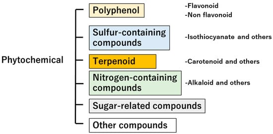 The term phytochemical is derived from the Greek word “phyto”, meaning plant, and is defined as a non-nutritive, physiologically active substance contained in plants such as vegetables and fruits [21,22]. Phytochemicals are classified into several categories (Figure 2) and exhibit various functionalities. Herein, we will introduce phytochemicals that have physiological effects on humans, based on previously published work. Nakamoto et al. reported the relationship between the intake of soybeans, soybean products, and isoflavones, which are polyphenols [23]. This study assessed the intake of beans, soy products, and soy isoflavones using a 3-day dietary diary, and showed that intake of soybeans and soy isoflavones could reduce the risk of cognitive impairment in elderly Japanese women. The functionality of flavonoid-isoflavones has been well studied, and they are one of the more interesting compounds, with not only estrogenic effects but also non-estrogenic effects extensively reviewed by Alshehri et al. [24]. Sulfur-containing compounds derived from plants have also been reported. Wu et al. reported that Moringa oleifera, a member of the Moringa family, contained 4-(α-L-rhamnosyloxy) benzyl isothiocyanate, also known as Moringa isothiocyanate. Moringa isothiocyanate has been reported to inhibit cancer growth and promote cancer cell apoptosis through multiple signaling pathways, and has also been shown to have anti-chronic-disease effects [25]. Yao et al. found that terpenoids regulated lipid metabolism disorders, insulin resistance, and oxidative stress via regulating the AMPK, PPAR, and Nrf-2 pathways, and were effective in the treatment of non-alcoholic fatty liver disease [26].